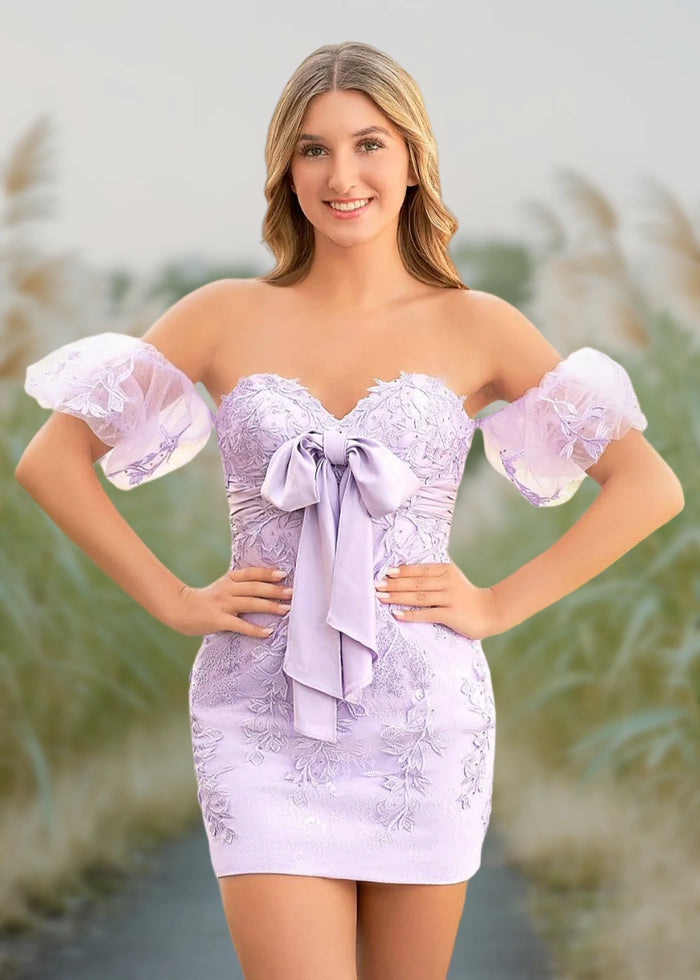 Elevate your homecoming look with this enchanting lavender homecoming dress! Designed as a strapless homecoming dress, it showcases a flattering silhouette with off-the-shoulder puff sleeves crafted from soft tulle. The front features a romantic homecoming dress bow, adding a sweet touch to the lace-adorned bodice. Made with high-quality lace and lightweight tulle, this dress ensures comfort and elegance. Priced affordably, it’s a budget-friendly choice for your special event—and don’t miss out: select orders enjoy free shipping! Embrace style, comfort, and charm with this standout piece.