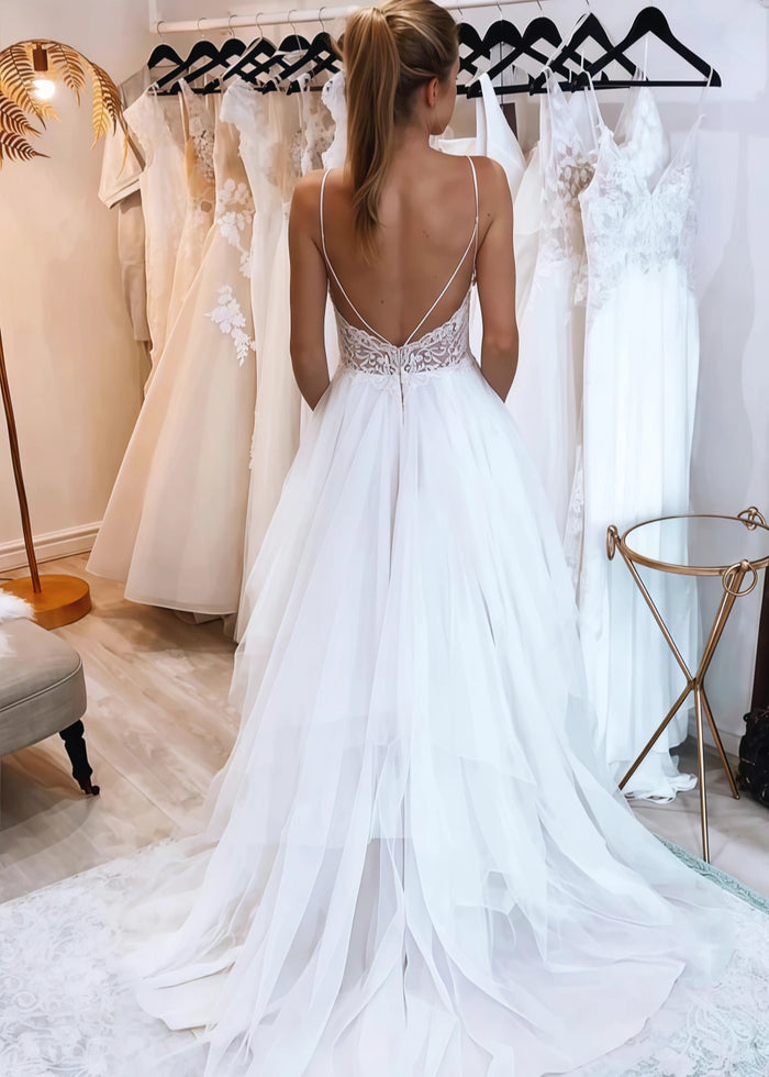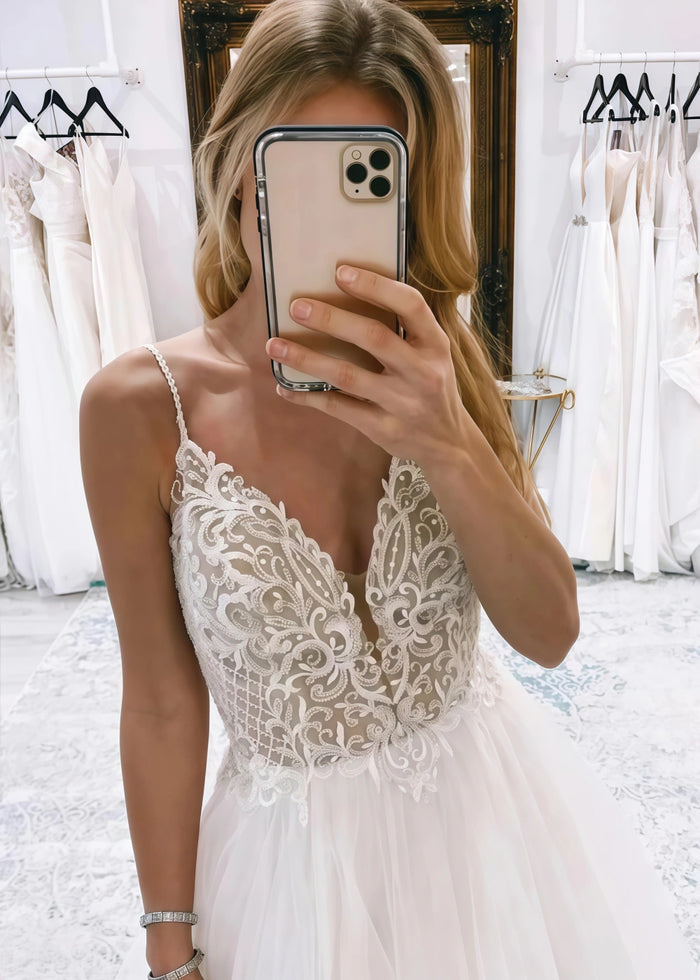 This dress features a romantic and airy design that is perfect for the free - spirited bride. The delicate lace detailing on the bodice adds a touch of elegance, while the plunging V - neckline creates a bold and alluring look. The back of the dress is equally captivating, with its open - back design and intricate lace patterns. The layers of soft tulle in the skirt give it a flowing and ethereal appearance, making you feel like a fairy - tale princess on your big day.