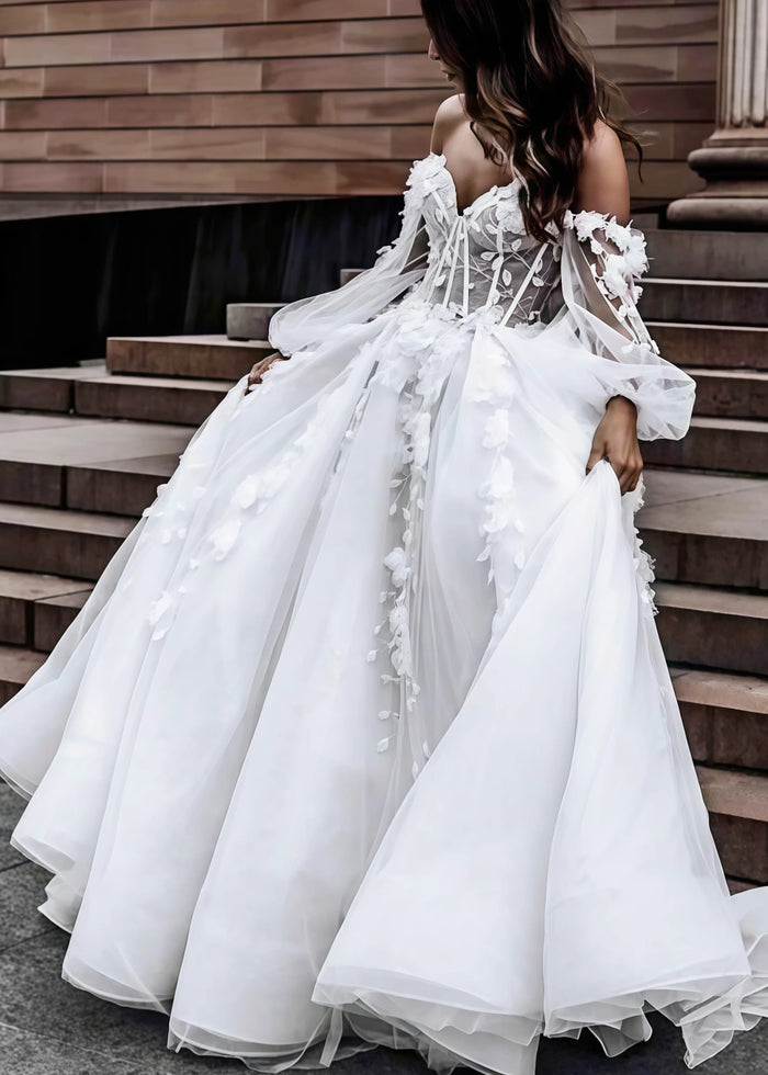 “From the moment I tried it on, I knew this dress was my soulmate. The floral details sparkled in the sunlight during our garden wedding, and the backless design felt incredibly empowering!” – Emma L.