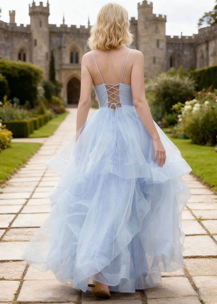 Check out this amazing light blue glitter tulle ruffled prom dress. It's perfect for your special night.