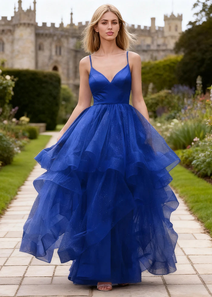 Check out this amazing royal blue glitter tulle ruffled prom dress. It's perfect for your special night.