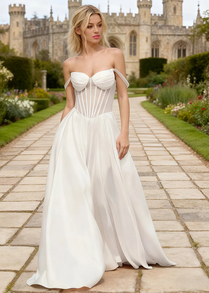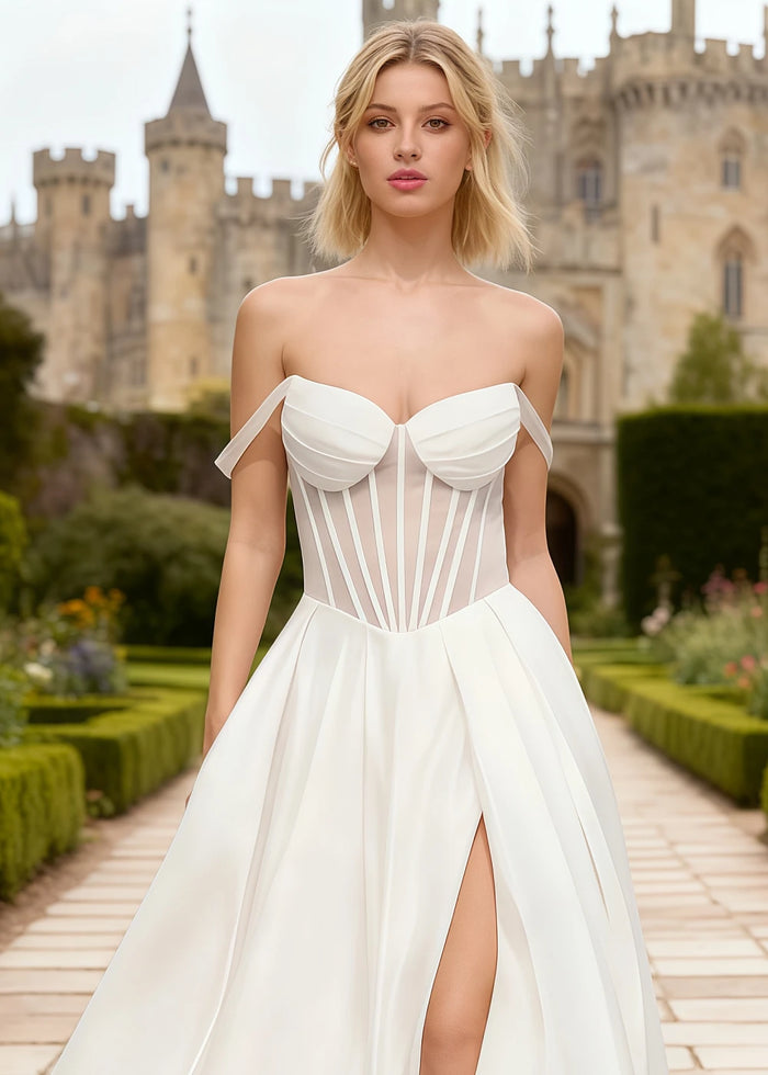 Meet your dream white satin prom dress corset! This beautiful black gown is both elegant and comfortable. The off-the-shoulder top has a corset style that fits you nicely. At the back, a lace-up design lets you adjust the dress for a perfect fit. The long skirt is made of shiny satin and light tulle, so it flows gracefully when you move. It also has a high slit to add a touch of charm. Plus, the dress is fully lined inside, making it soft against your skin. Ideal for proms, parties, or weddings, this dress will help you shine on your special night!