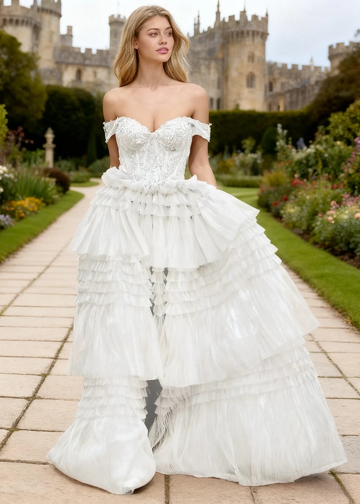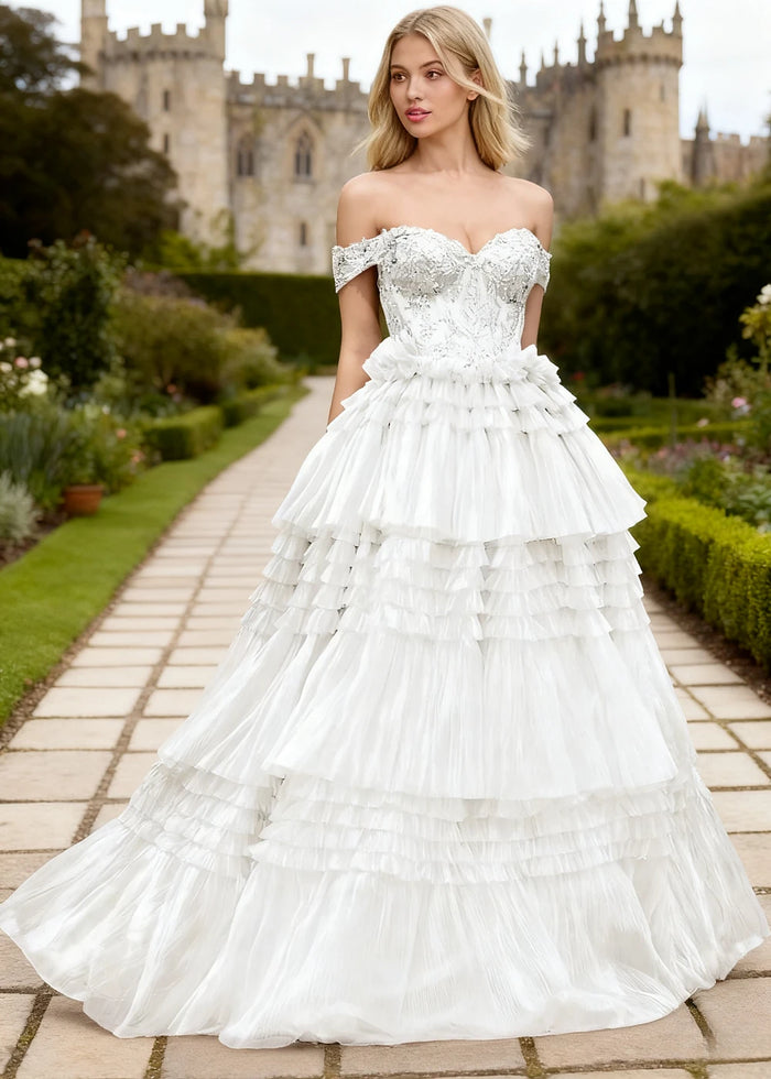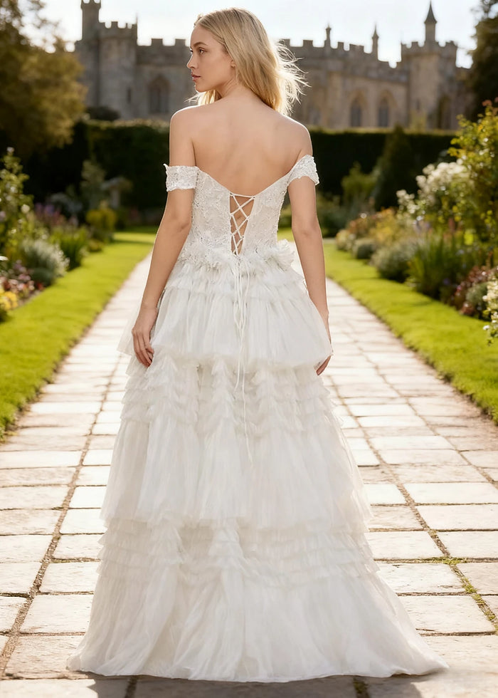 Look stunning in our beautiful sparkly white tiered tulle prom dress! It's perfect for your special night. This dress has sparkly sequins and pretty lace all over. The top is off-the-shoulder with a sweetheart neckline. The skirt is made of soft tulle layers, so it's full and fluffy. The back ties up with a cute lace-up design. Inside, it's fully lined for comfort. You'll feel like a princess at prom, weddings, or any fancy party. Get ready to turn heads and have fun!